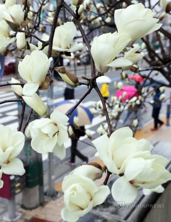 전국적으로 봄비가 내린 15일 부산 동래구에 있는 도로변에 목련이 꽃망울을 활짝 터뜨려 화사한 자태를 뽐내고 있다.
