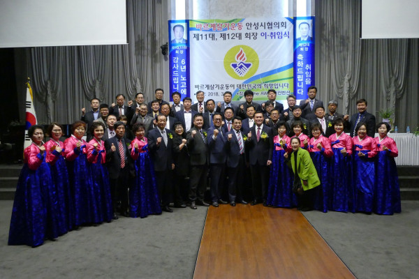 바르게살기운동 안성시협의회는 최근 THE AW컨벤션에서 제10·11대 회장 이임 및 제12대 회장 취임식을 개최했다. 이날 신임회장으로 민완종 회장이 취임했다. 사진은 취임식에 참여한 관계자들이 기념촬영을 하는 모습. (사진제공=안성시청)