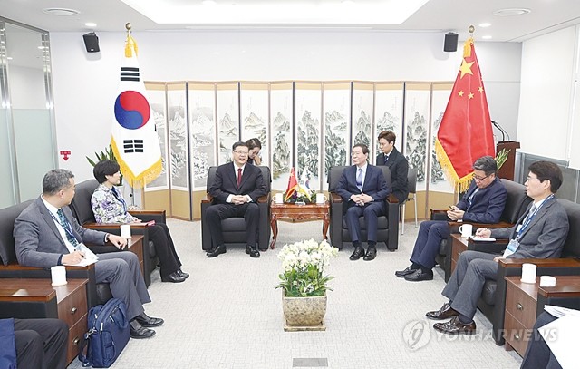 박원순 서울시장(오른쪽 네번째)과 천지닝(陳吉寧) 중국 베이징시장이 19일 서울시청에서 미세먼지 문제 공동 대응을 위한 ‘서울-베이징 통합위원회’ 3차 전체회의에 앞서 티타임을 하고 있다.