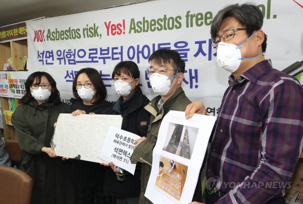 19일 서울 종로구 환경보건시민센터에서 열린 '학교석면 조사결과 및 안전대책 발표 기자회견'에서 최예용 소장(오른쪽)과 참석자들이 방진 마스크를 쓴 채 학교 체육관에서 발견된 석면텍스를 들어 보이고 있다.