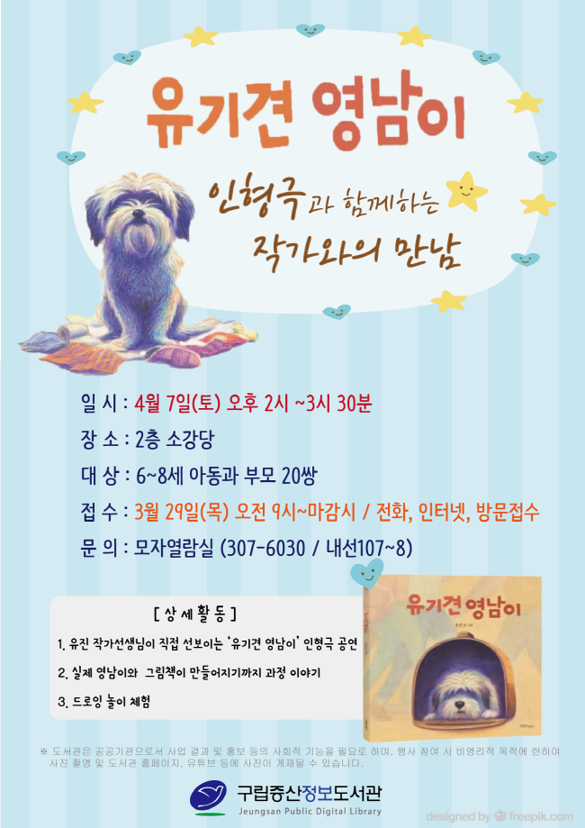 이번 행사는 오는 4월7일 도서관 소강당(2층)에서 ‘유기견 영남이’의 저자인 유진 작가를 초청해 작가가 직접 선보이는 1인 인형극 공연과 작품 소개, 드로잉 체험 등을 진행한다.