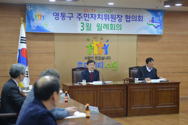 경기 수원시 영통구는 19일 구청 상황실에서 '주민자치위원장협의회 3월 월례회의'를 개최했다. 사진은 관계자들이 올해 주요활동 방향에 대해 의견을 나누는 모습. (사진제공=영통구청)