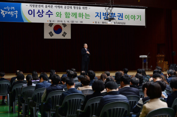 동대문구가 최근 구청 다목적강당에서 전직원을 대상으로 ‘지방분권이야기 특강’을 개최했다. 특강은 현재 국회 개헌특위자문위원 및 헌법개정국민주권회의 공동대표인 이상수 변호사가 진행했다. 사진은 이 변호사가 강의를 하고 있는 모습. (사진제공=동대문구청)