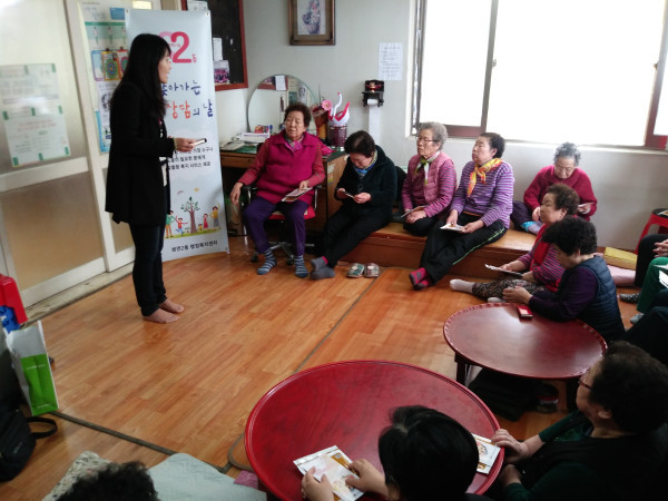 경기 동두천시 생연2동 행정복지센터는 20일 노인들을 대상으로 부영아파트 5단지 경로당에서 소외계층 발굴 및 위기상황에 놓인 가정에 복지서비스를 제공하기 위한 홍보활동으로 행복드림의 날을 운영했다. 사진은 센터 관계자가 노인에게 복지서비스를 홍보하는 모습. (사진제공=동두천시청)