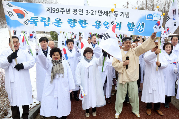 경기 용인시는 21일 일제강점기 용인만세운동이 시작된 현장인 처인구 원삼면 좌찬고개 소재 ‘3.1만세운동 기념공원’에서 ‘제99주년 용인 3.21만세운동 기념행사’를 개최했다. 사진은 행사에 참석한 관계자들이 만세 삼창을 외치는 모습. (사진제공=용인시청)