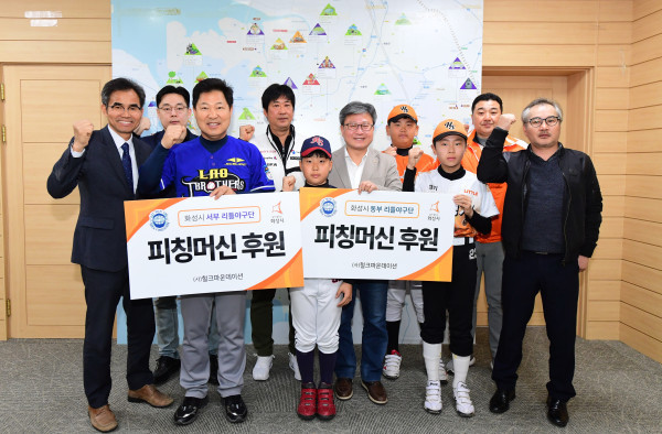경기 화성시 리틀야구단은 비영리 사단법인 헐크파운데이션으로부터 총 1400만원 상당의 피칭머신 2대를 기증받았다. 사진은 이만수 헐크파운데이션 이사장, 리틀야구단 소속 아동들과 관계자들이 기념촬영을 하는 모습. (사진제공=화성시청)