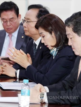 22일 오전 국회 의원회관에서 열린 자유한국당 중진의원 간담회에서 참석자들이 굳은 표정으로 앉아 있다. 이날 모임은 최근 지방선거를 앞두고 자유한국당 홍준표 대표가 당 운영을 폐쇄적으로 한다는 지적이 나오면서 중진의원들이 관련해 의견을 나누고자 마련됐다. 왼쪽부터 정우택·이주영·나경원 의원.