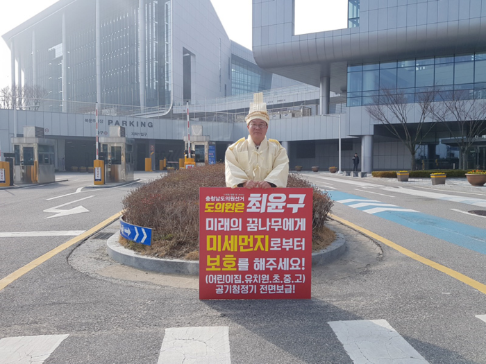 6.13 지방선거에 충남도의원 출마를 선언한 최윤구(신방동.쌍용1동) 예비후보가 26일 오전 충남도청 앞에서 자라나는 미래 꿈나무들을 미세먼지로부터 보호해 달라는 1인 시위를 하고 있다.(사진=장인진 기자)
