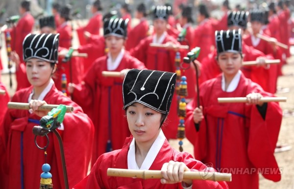 26일 오전 서울 종로구 성균관 대성전에서 유교의 성인과 선현들의 학덕을 기리는 제례의식인 춘기석전이 열리고 있다.
