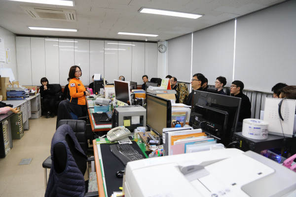 서울 영등포소방서는 최근 문래동에 위치한 인쇄업체인 대명 에스피 사무실을 찾아 직원 20여명을 대상으로 '시민안전파수꾼 교육'을 실시했다. 사진은 소방관이 안전사고 예방법에 대해 설명하고 있는 모습. (사진제공=영등포소방서)