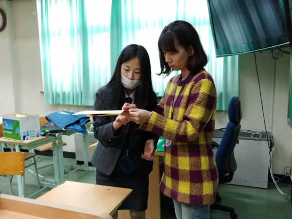 경기 수원시 권선구는 지난 21, 23일 양일간 화홍·고색고등학교에 재학 중인 만 17세 학생을 대상으로 찾아가는 신규 주민등록증 발급 서비스를 실시했다. 사진은 주민등록 담당자와 학생이 주민등록증을 살펴보고 있는 모습. (사진제공=권선구청)