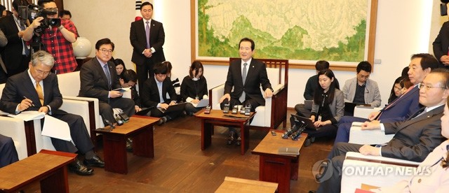 정세균 국회의장과 더불어민주당 우원식, 자유한국당 김성태, 바른미래당 김동철 원내대표가 26일 오후 국회에서 열린 여야 3당 교섭단체 원내대표 정례회동에서 정부개헌안을 비롯한 현안을 논의하고 있다.