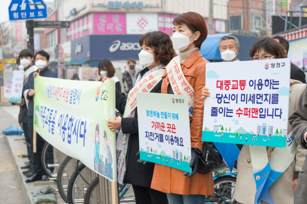 양천구가 26일 오전 지역내 신정네거리역 일대에서 ‘미세먼지저감 캠페인’을 진행했다. 구는 서울형 미세먼지 비상저감조치발령시 구민들이 승용차 2부제에 참여하고 대중교통을 이용할 수 있도록 홍보했다. 사진은 구 직원들이 캠페인에 참여하고 있는 모습. (사진제공=양천구청)