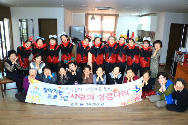 지난 26일 경기 수원시 영통구 광교1동 주민자치위원회는 자연앤자이2단지 경로당에서 올해 첫 '사랑의 징검다리' 행사를 진행했다. 사진은 행사가 끝난 후 참여자들이 기념촬영을 하는 모습. (사진제공=영통구청)