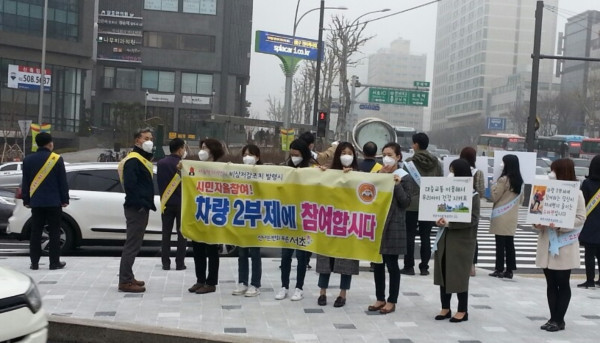 지난 26일 서초구가 ‘서울시 미세먼지 비상저감조치’ 발령에 따라 주민 참여를 이끌어내기 위해 양재역 사거리 주변에서 자육적 차량 2부제, 대중교통 이용 등의 문구가 담긴 피켓 및 현수막을 들고 ‘미세먼지 비상저감조치 구민실천 캠페인’을 펼쳤다. (사진제공=서초구청)