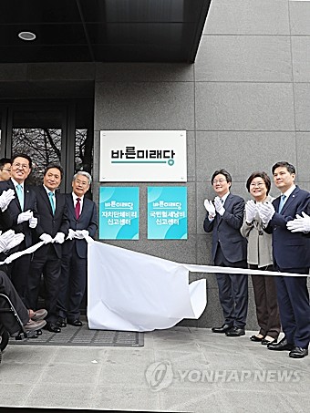 28일 오전 서울 여의도 바른미래당 당사 앞에서 유승민 공동대표, 김동철 원내대표를 비롯한 참석자들이 '자치단체비리신고센터' 및 '국민혈세낭비신고센터' 현판식을 하고 있다.