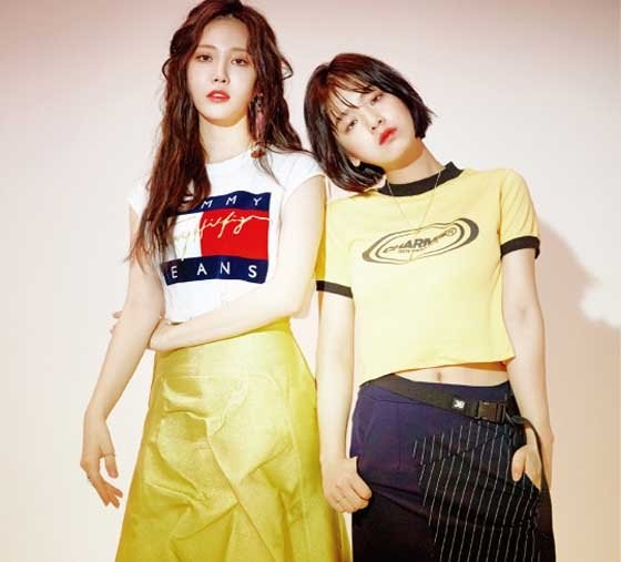 공개된 사진 속 유라와 이주영은 '깔맞춤' 시밀러 룩을 연출해 눈길을 끈다. 유라는 프린팅 티셔츠에 노란 롱 스커트를 매치했다. 이주영은 검정과 노랑 배색의 크롭트 티에 독특한 언밸런스 디자인의 하의를 착용했다.