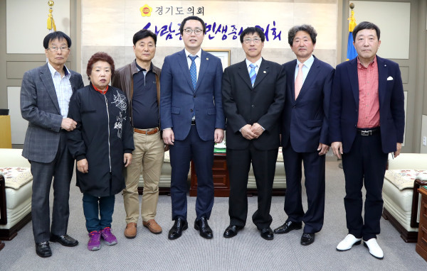 경기도의회 정기열 의장은 최근 도의회 의장 접견실에서 전국 민속5일장 중앙회 이호영 회장 등 임원진을 만나 민속 5일장 운영에 대한 애로사항을 청취하고 향후 민속 5일장의 활성화 및 발전방안을 심도 있게 논의했다. 사진은 기념촬영 중인 모습. (사진제공=경기도의회)