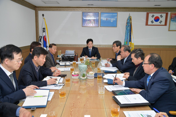 경기 포천시는 28일 시장 집무실에서 안전건설국장과 건설과장, 기획예산과장 등이 참석한 가운데 ‘도로교통 기반시설 구축을 위한 사업비 확보 대책’을 논의했다. 사진은 도로 관련 예산확보 방법을 논의하고 있는 시 관계자들의 모습. (사진제공=포천시청)