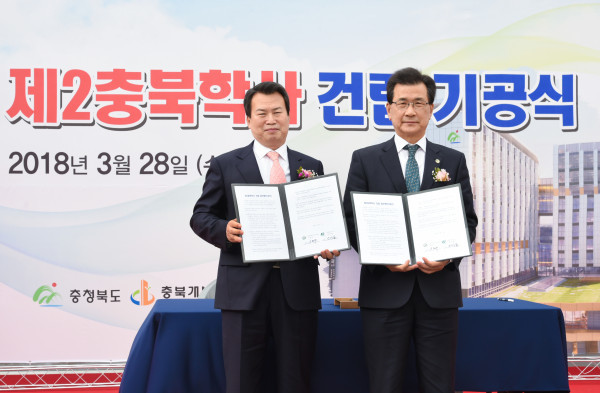 중랑구는 28일 중화동 제2충북학사 건립 기공식을 개최했다. 사진은 기공식에 참석한 구청장과 충북도지사가 제2충북학사 관련 협약을 체결한 후 기념촬영을 하는 모습. 사진제공=중랑구청)