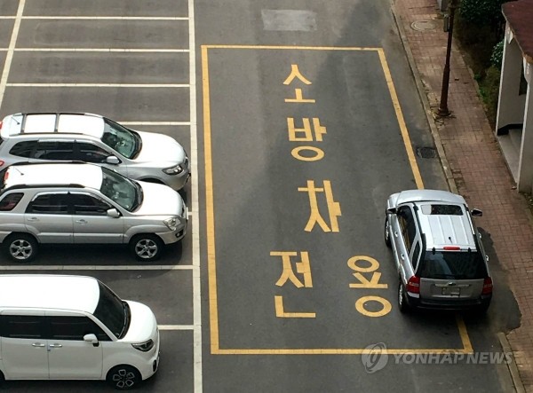 29일 광주 북부소방서는 관련법 개정에 따라 소방차 전용구역 의무설치를 독려하고, 불법주차를 방지하기 위해 공동주택 관계자들을 대상으로 적극적으로 홍보활동에 나선다고 밝혔다. 사진은 오는 8월10일부터 최대 100만원 과태료 부과 대상인 아파트 단지 내 소방차 전용구역에 불법주차된 차량의 모습.