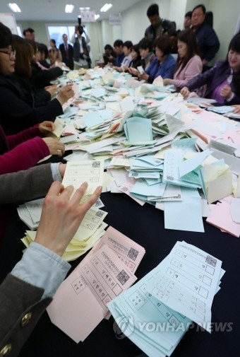 29일 인천시 부평구 청천동 부평구선거관리위원회에서 열린 '6·13 제7회 전국동시지방선거 개표시연회'에서 개표사무원들이 투표용지 분류작업을 시연하고 있다.