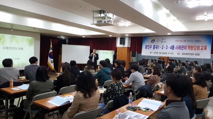 광진구 중곡3동주민센터는 지난 26일 ‘민·학·관 사례관리 실무자 역량강화 교육’을 실시했다. 사진은 유서구 숭실대 사회복지학과 교수가 ‘자원간 연계구축’이란 주제로 강의를 진행하는 모습.(사진제공=광진구청)