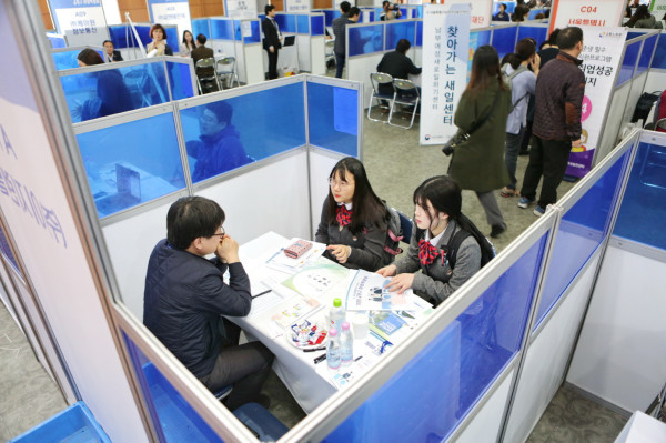 금천구는 29일 오후 2시 구청 대강당에서 ‘2018년 취업박람회’를 개최했다. 사진은 취업박람회를 찾은 취업준비생들이 채용 상담을 받고 있는 모습. (사진제공=금천구청)