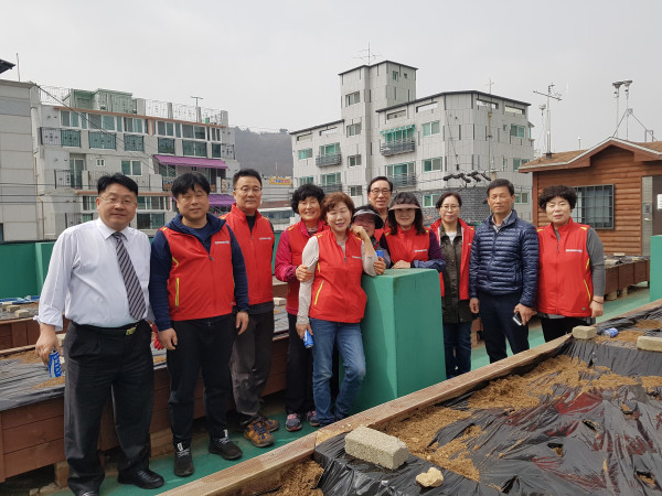 경기 김포시 사우동 주민자치위원회가 최근 사우동 주민센터 옥상 텃밭에 이웃에게 나눌 사랑의 감자를 심었다. 사우동 옥상텃밭 가꾸기는 2013년부터 실시된 지역특성화사업의 일환으로, 작물을 어려운 이웃과 나눠왔다. 사진은 감자심기 행사를 기념해 자치위원회 관계자들이 기념촬영을 하는 모습. (사진제공=김포시청)