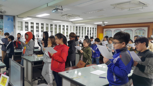 최근 경기 부천시 원미초등학교에서는 원미 학생자치회 학생들을 대상으로 ‘리더십 캠프’를 실시했다. 사진은 학생들이 자신만의 리더선언문을 만들고 함께 선서식을 하는 모습. (사진제공=원미초등학교)