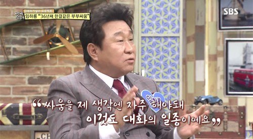 이날 방송에서 임하룡은 "결혼 36년 차니까 부부싸움을 안 하지 않냐?"는 김원희의 물음에 "많이 한다"고 답하며 "내 생각엔 부부싸움을 자주 해야 된다. 이것도 대화의 일종이기 때문"이라는 견해를 밝혔다.
