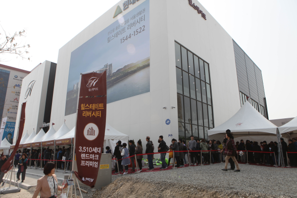 | ▲ 힐스테이트 리버시티 견본주택 관람을 위해 줄지어 기다리고 있는 모습. | ||