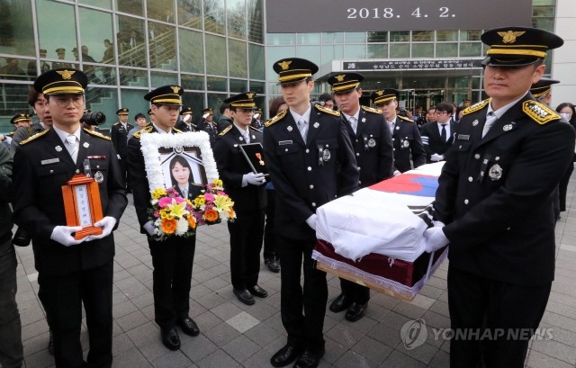 43번 국도변에서 구조활동을 벌이다 숨진 소방관과 소방관 임용예정 교육생 등 3명에 대한 합동영결식이 2일 아산 이순신체육관에서 열렸다. 소방공무원 동료들이 고인의 시신을 운구차량에 싣고 있다.