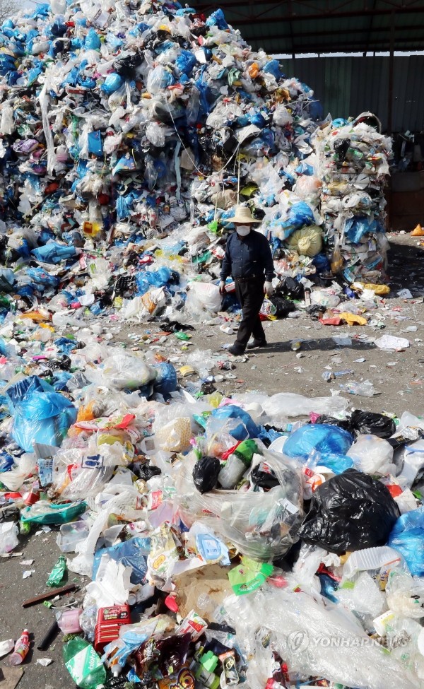 재활용품 수거 중단과 처리비용 증가가 사회적 문제가 되고 있는 가운데 2일 오전 광주 북구 재활용품선별장에 처리하지 못한 재활용품이 산더미처럼 쌓여있다.