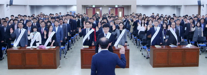 전남도교육청은 2일 도교육청 대회의실에서 전 직원이 참석한 가운데 청렴실천 결의대회를 개최하고, 공직 비리 근절을 위한 청렴교육을 실시했다. 사진은 직원들이 청렴결의를 위한 선서를 하는 모습.(사진제공=전남도교육청)