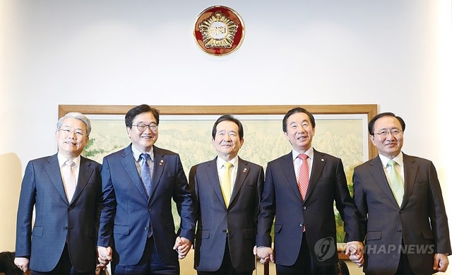 정세균 국회의장(가운데)이 2일 오전 국회에서 교섭단체 원내대표단 정례회동에 앞서 기념촬영을 하고 있다. 왼쪽부터 바른미래당 김동철·더불어민주당 우원식 원내대표·정세균 국회의장, 자유한국당 김성태·평화와 정의의 의원 모임 노회찬 원내대표.
