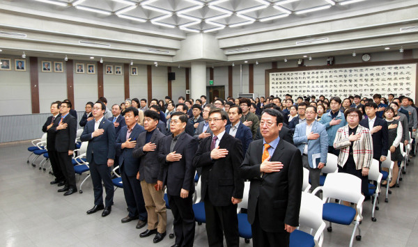 | ▲ 리프레싱 특강에 앞서 열린 월례조회에서 경기도의회 사무처 직원 등 의회 관계자들이 국기에 대한 경례를 하고 있다. 이날 특강은 한반도 국제정세를 주제로 열렸다. (사진제공=경기도의회) | ||