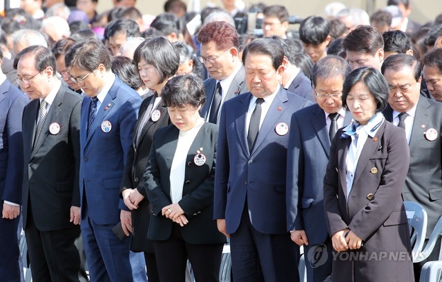 3일 오전 제주시 봉개동 4.3 평화공원에서 열린 제70주년 4.3희생자 추념식에 여야 대표들이 참석해 묵념하고 있다. 오른쪽부터 더불어민주당 추미애 대표, 자유한국당 홍준표 대표, 바른미래당 박주선 공동대표, 민주평화당 조배숙 대표, 정의당 이정미 대표, 더불어민주당 우원식 원내대표, 정의당 노회찬 원내대표.