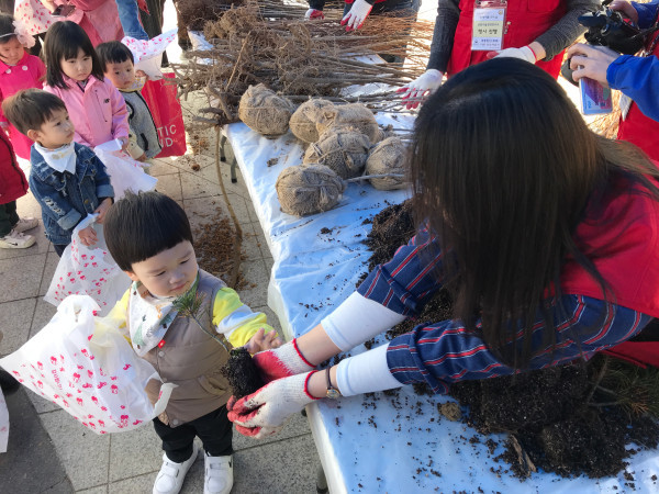 경기 포천시와 산림청 국립산림과학원은 ‘제73회 식목일’을 맞이해 지난 3월30일 포천체육공원에서 지역주민과 유관기관 관계자 등을 대상으로 ‘광릉 원산(原産) 나무 나눠주기’ 행사를 개최했다. 사진은 행사에 참석한 어린이들이 나무 모종을 전달받는 모습. (사진제공=포천시청)