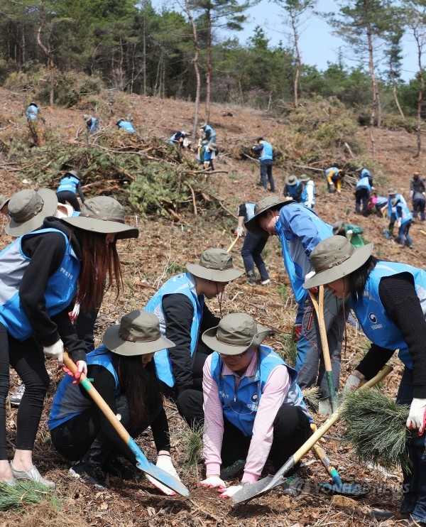 식목일을 하루 앞둔 4일 오후 경기도 용인시 처인구 남사면의 한 산에서 열린 '제73회 행정안전부 식목일 행사'에서 행정안전부 직원들이 나무를 심고 있다.