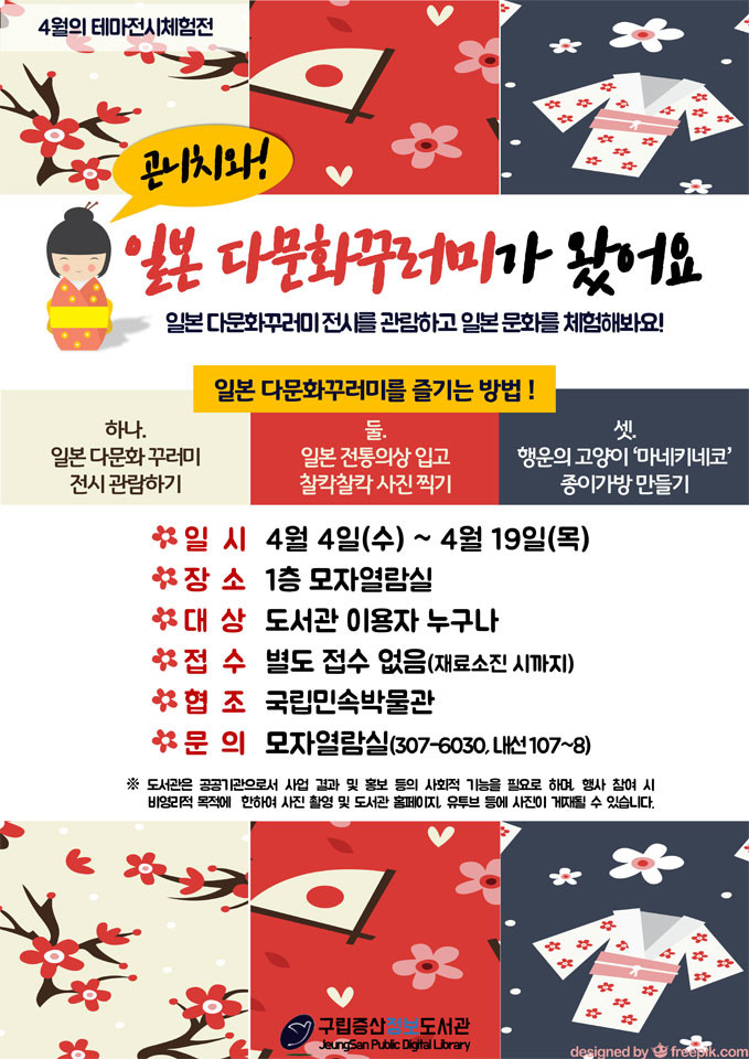 이번 체험전에는서는 국립민속박물관에서 대여하는 다문화꾸러미를 활용, ▲일본 전통의상 ▲생활용품 ▲축제 관련 자료를 전시한다. 이후 일본 전통의상 입고 사진찍기, 행운의 고양이 ‘마네키네코’ 종이가방 만들기 등의 체험활동도 진행한다.