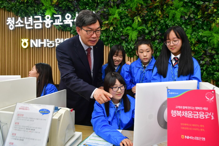 [시민일보=이진원 기자]이대훈 NH농협은행장이 지난 3일 서울 중구 농협은행 본사에 위치한 ‘청소년 금융교육센터’에서 경기지역 중학생 60여명을 대상으로 실시한 ‘행복채움금융교실’에 일일교사로 나섰다.