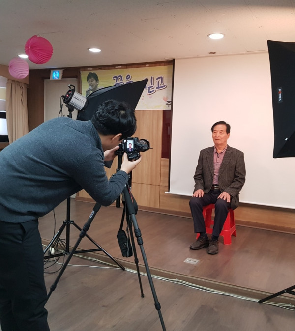 최근 서울 은평구 갈현2동 주민센터가 갈현동새마을금고에서 65세 이상 노인 5~6명을 대상으로 ‘사랑의 장수사진’ 행사를 실시했다. 이날 행사는 갈현2동 지역사회보장협의체 주관해 갈현동새마을금고, 헤어파체의 후원으로 진행됐다. 사진은 한 노인의 장수사진 촬영 모습. (사진제공=은평구청)