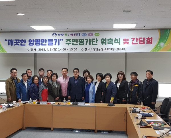 경기 양평군이 지난 3일 군청 소회의실에서 ‘삶의 행복 운동’의 실천과제 중 하나인 청결과 연계해 진행하는 ‘깨끗한 양평만들기’ 활동을 위한 주민평가단의 위촉식을 개최했다. 사진은 신규 위촉된 관계자들이 위촉식 후 기념촬영을 하는 모습. (사진제공=양평군청)
