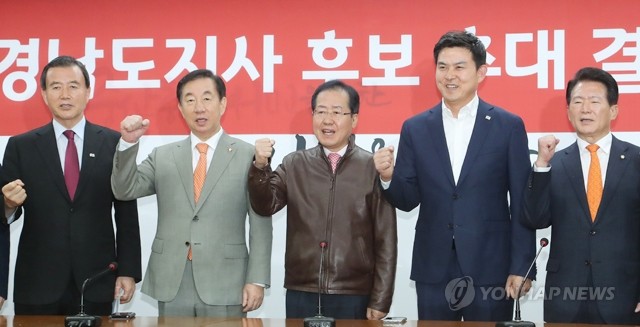 자유한국당 홍준표 대표(가운데), 김성태 원내대표(왼쪽 두번째) 등 당직자들이 5일 서울 여의도 당사에서 열린 경남도지사 후보 추대 결의식에서 김태호 예비후보(왼쪽 네번째)와 파이팅을 외치며 기념촬영하고 있다.