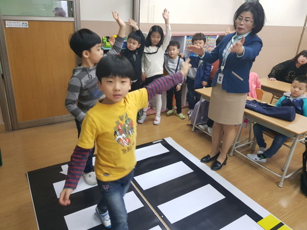 경기 부천시 도당초등학교는 지난 5~6일 양일간 초등학교 1~2학년을 대상으로 교통안전교육을 실시했다. 사진은 참여한 학생들이 횡단보도 건너는 실습을 하는 모습.(사진제공=부천교육지원청)