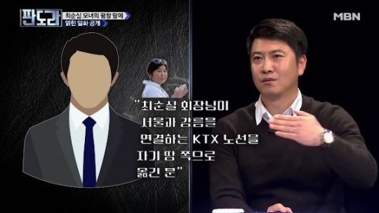 노 씨는 "모른다고 했더니 (최순실을 잘 아는 분이) 저분(최순실)이 서울과 강릉을 연결하는 KTX 노선을 자기 땅으로 끌어들인 사람이다. 노선을 변경한 사람이라는 이야기를 했다"고 폭로했다. 그는 "저도 (그 얘기를) 믿지는 않았다. 아직 확인된 바도 없다"고 덧붙였다.