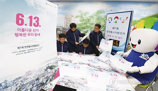 제7회 전국동시지방선거를 66일 앞둔 8일 오전 경기도 수원시 경기도선거관리위원회에서 직원들이 지방선거 홍보 포스터를 점검하고 있다.