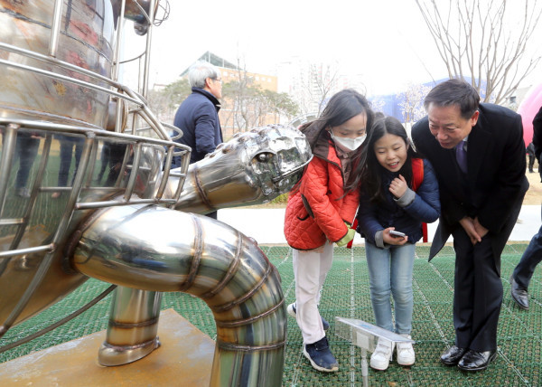 금천구는 지난 6일 오후 5시 금천구청 뒤편 금나래중앙공원에서 조각전 ‘見生展(견생전)’ 개막과 ‘숨고래’ 완공 기념행사를 개최했다. 사진은 행사에서 구청장이 어린이들과 함께 조각품을 둘러보고 있는 모습. (사진제공=금천구청)