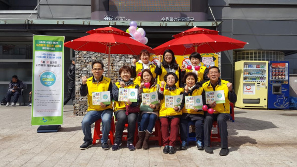 경기 수원시 팔달구는 지난 7일 주민참여예산 팔달구 지역회의 위원 10명이 참석한 가운데 영동시장 지동교 부근에서 수원시민을 대상으로 주민참여예산 홍보 캠페인을 실시했다. 사진은 캠페인 참여자들이 기념촬영을 하는 모습. (사진제공=팔달구청)